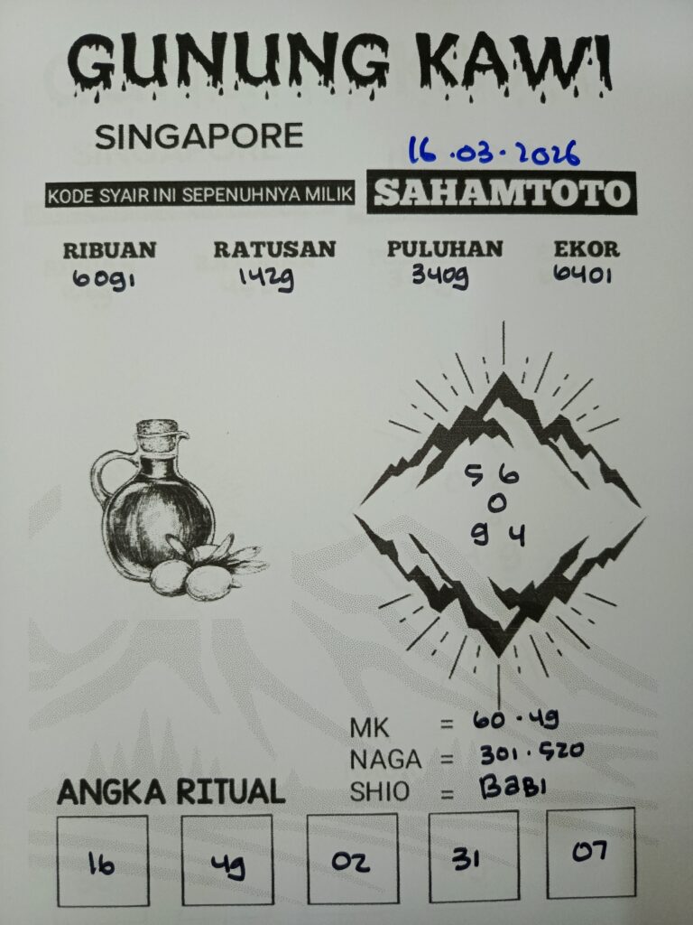 Syair Gunung Kawi Singapore Pools Hari ini Senin 16 Maret 2026