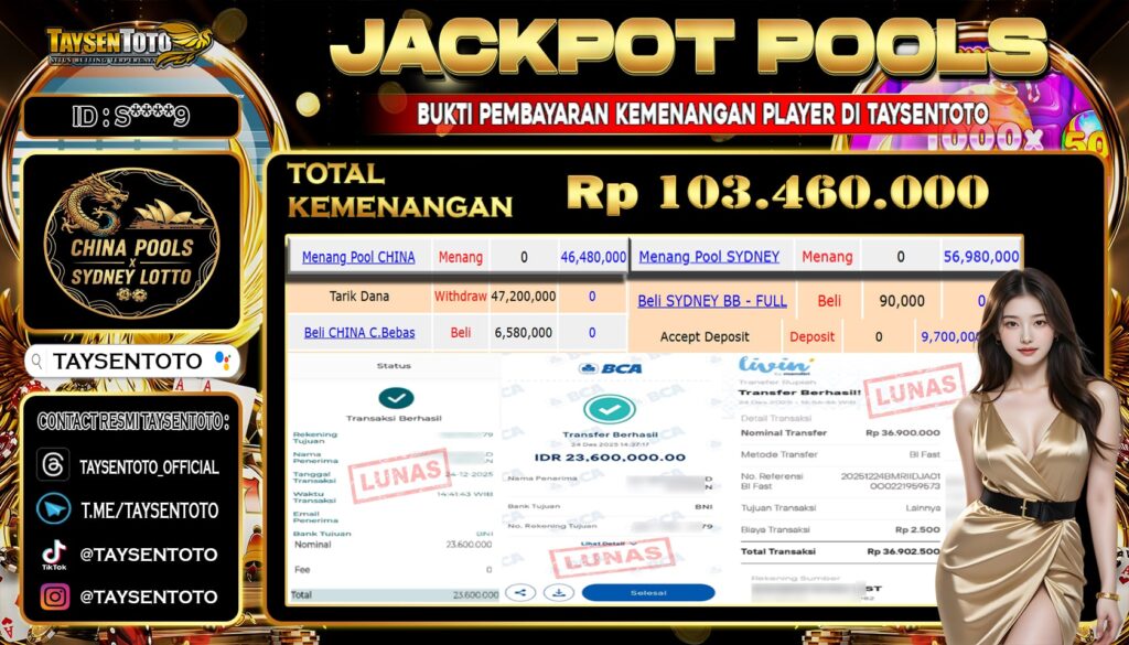 TAYSENTOTO JACKPOT DI PASARAN SYDNEY LOTTO & CHINA POOLS 103.460.000 – LUNAS !! ( 24 DESEMBER 2025 )