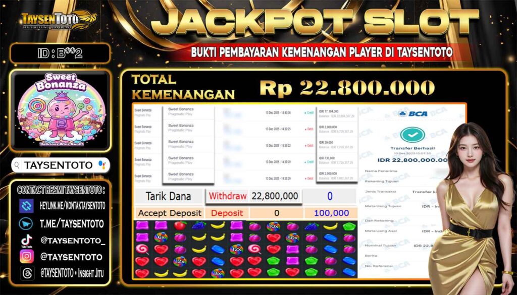 TAYSENTOTO JACKPOT DI PERMAINAN SWEET BONANZA 22.800.000 – LUNAS !! ( 13 DESEMBER 2025 ) Selamat Kepada Member Setia TAYSENTOTO Userid : B**2 Jackpot di PERMAINAN SWEET BONANZA (SLOT) RP 22.800.000.- Langsung di Dibayar LUNAS!!