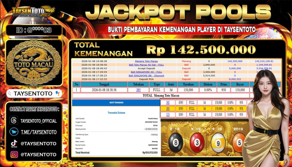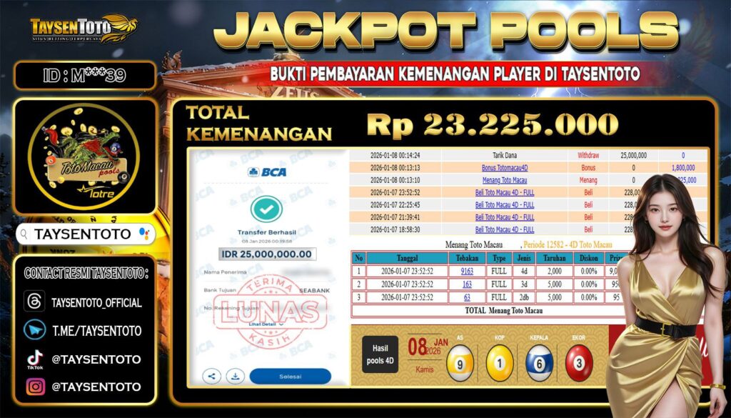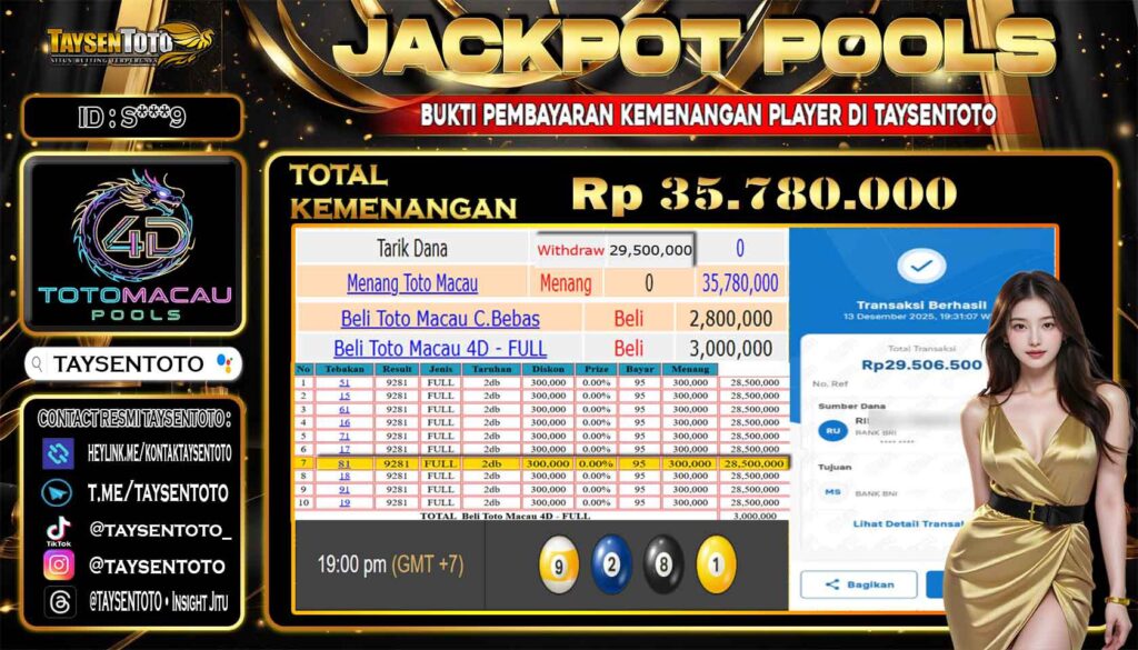 TAYSENTOTO JACKPOT DI PASARAN TOTOMACAU4D P3 POOLS 35.780.000 – LUNAS !! ( 13 DESEMBER 2025 ) Selamat Kepada Member Setia TAYSENTOTO Userid : S***9 Jackpot di PASARAN TOTOMACAU4D P3 POOLS (TOGEL) RP 29.500.000.- Langsung di Dibayar LUNAS!!