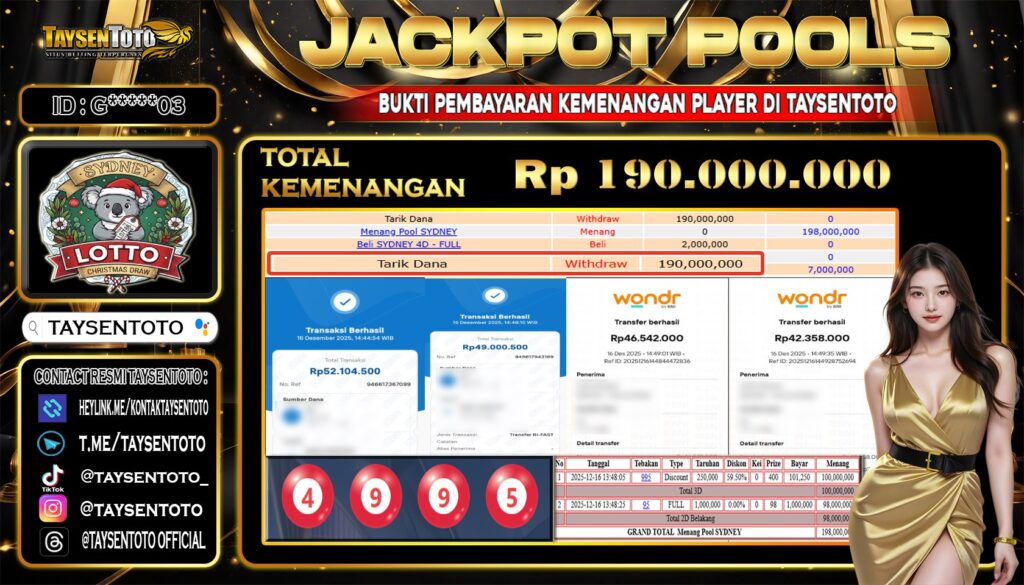 TAYSENTOTO JACKPOT DI PASARAN SYDNEY LOTTO Rp.190.000.000 – LUNAS !! ( 16 DESEMBER 2025 ) Selamat Kepada Member Setia TAYSENTOTO Userid : G****03 Jackpot di PASARAN SYDNEY LOTTO (TOGEL) RP 190.000.000.- Langsung di Dibayar LUNAS!!