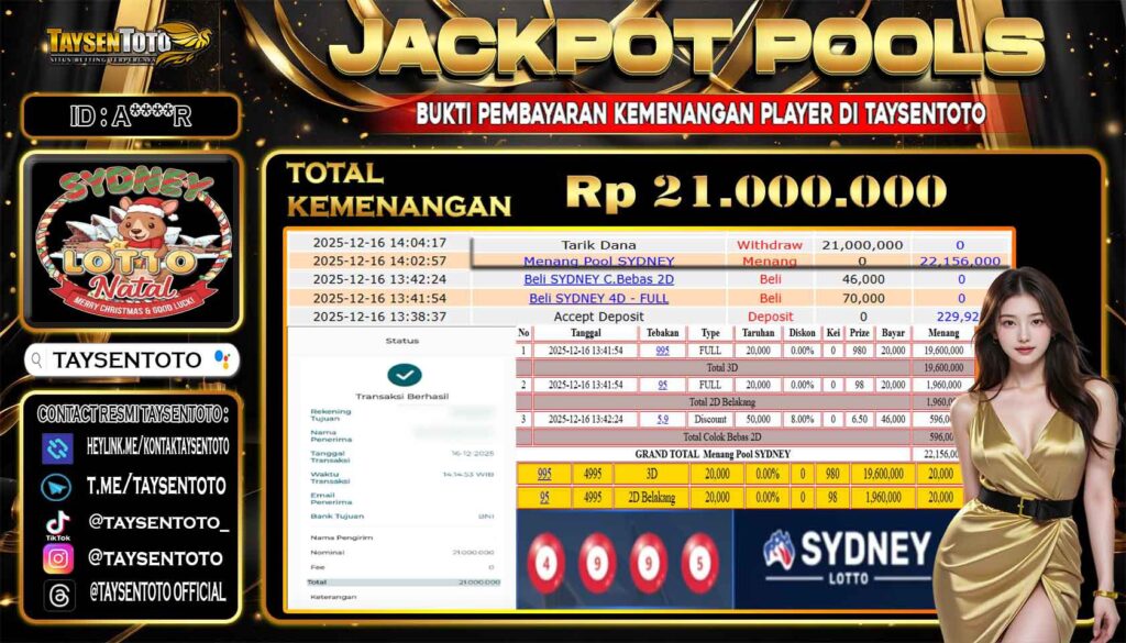 TAYSENTOTO JACKPOT DI PASARAN SYDNEY LOTTO 21.000.000 – LUNAS !! ( 16 DESEMBER 2025 ) Selamat Kepada Member Setia TAYSENTOTO Userid : A****R Jackpot di PASARAN SYDNEY LOTTO (TOGEL) RP 21.000.000.- Langsung di Dibayar LUNAS!!