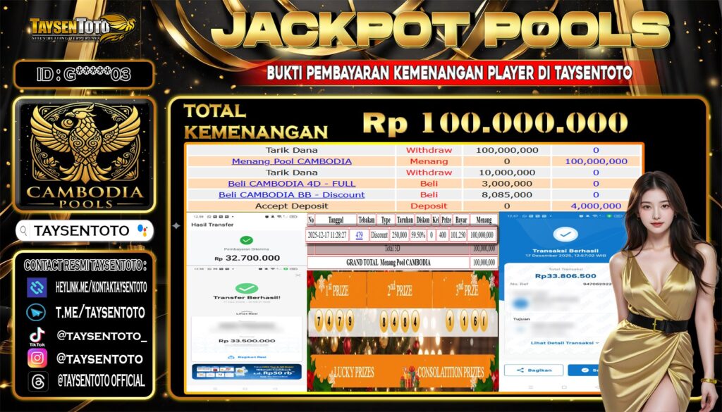 TAYSENTOTO JACKPOT DI PASARAN CAMBODIA POOLS Rp.100.000.000 – LUNAS !! ( 17 DESEMBER 2025 ) Selamat Kepada Member Setia TAYSENTOTO Userid : G****03 Jackpot di PASARAN CAMBODIA POOLS (TOGEL) Rp.100.000.000.- Langsung di Dibayar LUNAS!!