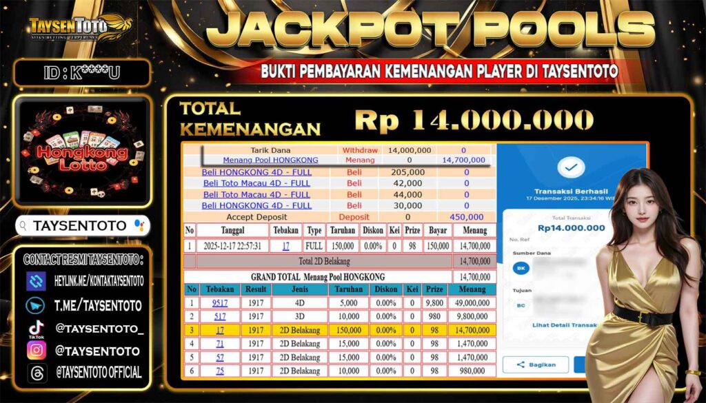 TAYSENTOTO JACKPOT DI PASARAN HONGKONG LOTTO 14.000.000 – LUNAS !! ( 17 DESEMBER 2025 )