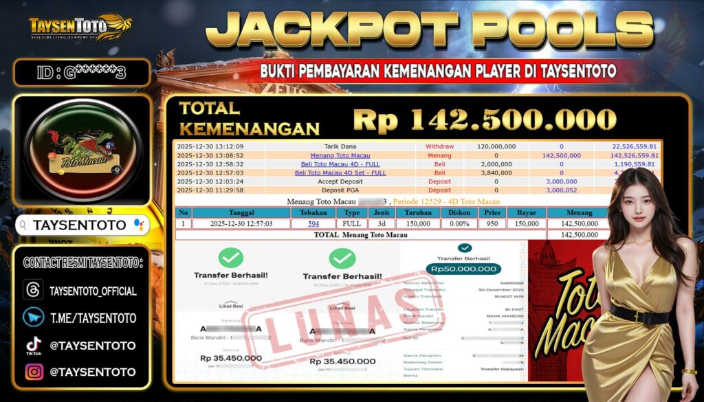TAYSENTOTO JACKPOT DI PASARAN TOTO MACAU 4D P1 POOLS 142,500,000 – LUNAS !! ( 30 DESEMBER 2025 )