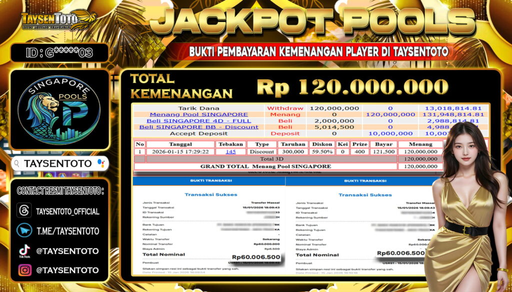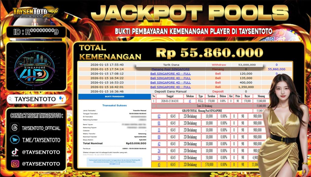 TAYSENTOTO JACKPOT DI PASARAN SINGAPORE 4D POOLS 120.000.000 – LUNAS !! ( 15 JANUARI 2026 )