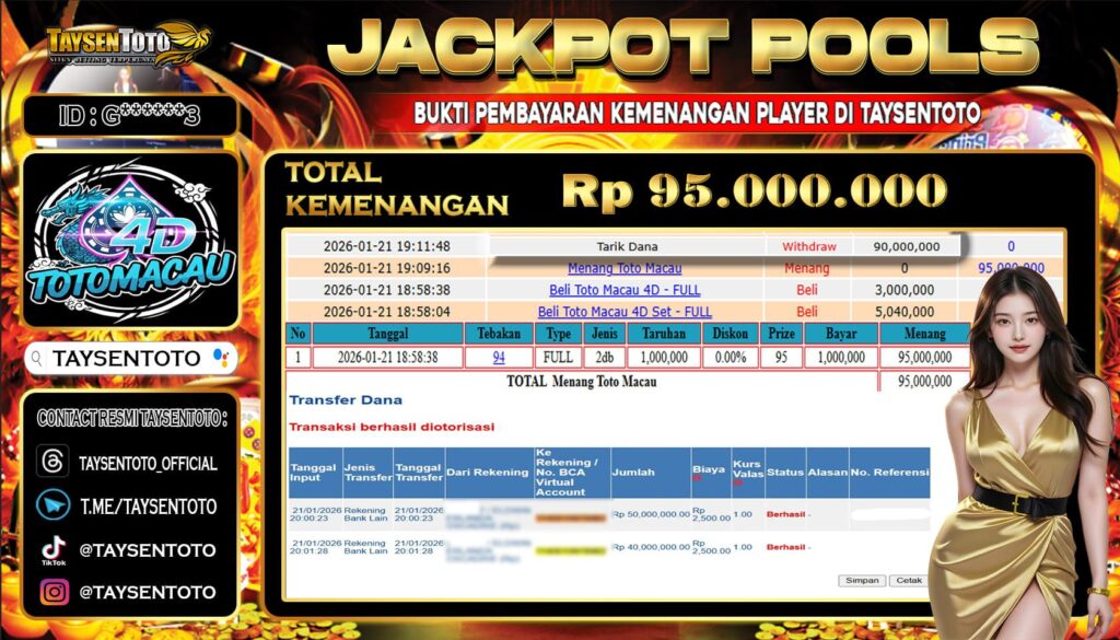 TAYSENTOTO JACKPOT DI PASARAN TOTO MACAU 4D P2 RP 95.000.000.- LUNAS !! ( 29 NOVEMBER 2025 ) Selamat Kepada Member Setia TAYSENTOTO Userid : G*****02 Jackpot di PASARAN TOTO MACAU 4D P2 ( TOGEL ) RP 95.000.000.- – Langung di Dibayar LUNAS!!