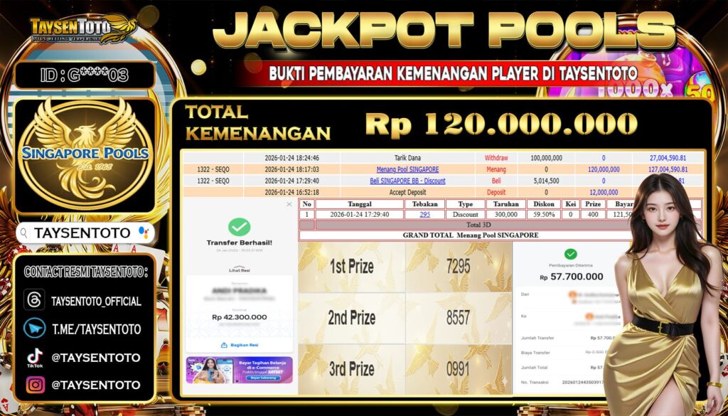 TAYSENTOTO JACKPOT DI PASARAN SINGAPORE 4D POOLS 120.000.000 – LUNAS !! ( 15 JANUARI 2026 )