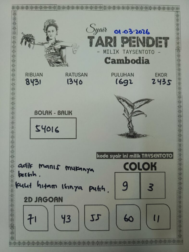 Syair Tari Pendet Cambodia Hari Ini Minggu, 01 Maret 2026