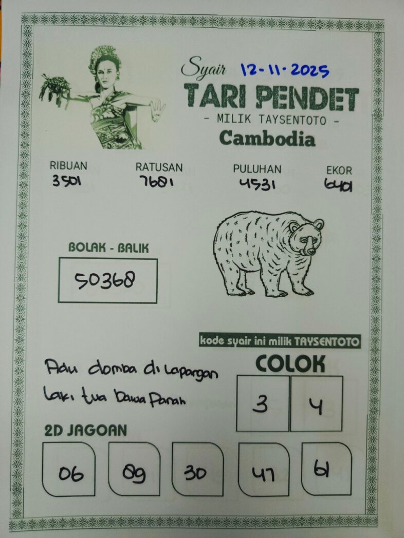 Syair Tari Pendet Cambodia Hari Ini Rabu, 12 November 2025