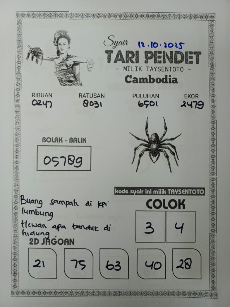 SYAIR TAYSEN CAMBODIA– Selamat datang di Situs Prediksi Togel Jitu dan Terpercaya. Hari ini kita akan mengulas Syair Togel Cambodia 12 Oktober 2025. Syair Cambodia ini semata-mata hanya dibuat untuk membantu mempermudah para pemain toto gelap online dalam menebak secara tepat Angka Keluaran Cambodia.