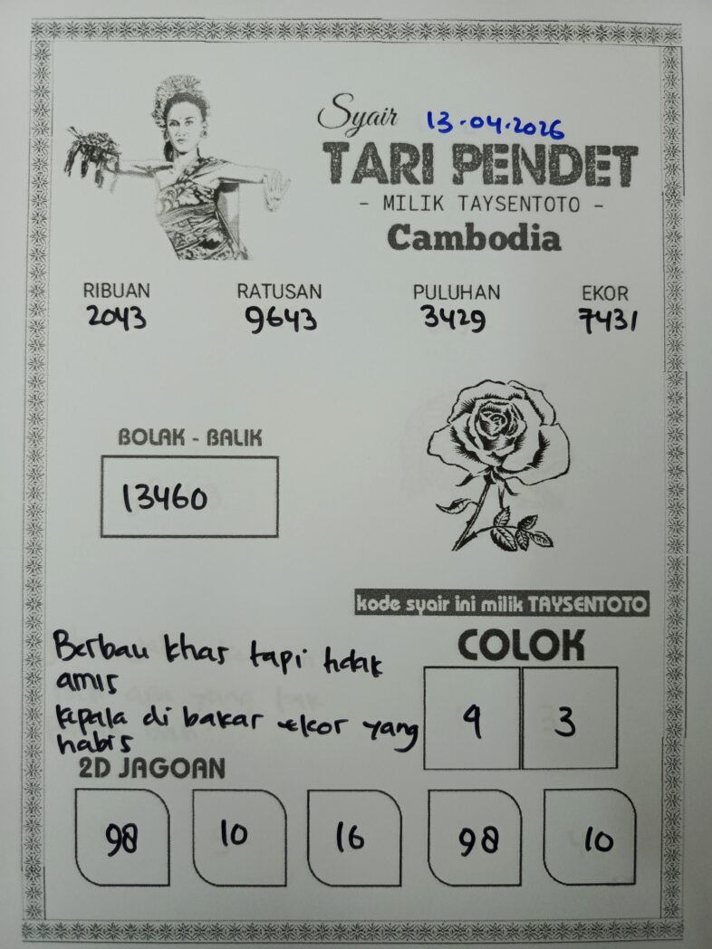 Syair Tari Pendet Cambodia Hari Ini Senin, 13 April 2026