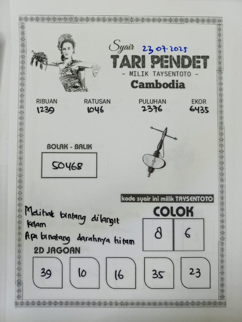 SYAIR TAYSEN CAMBODIA– Selamat datang di Situs Prediksi Togel Jitu dan Terpercaya. Hari ini kita akan mengulas Syair Togel Cambodia 23 Juli 2025. Syair Cambodia ini semata-mata hanya dibuat untuk membantu mempermudah para pemain toto gelap online dalam menebak secara tepat Angka Keluaran Cambodia.
