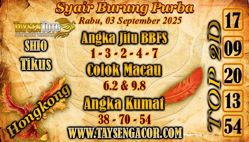 SYAIR TAYSEN HK – Selamat datang di Situs Prediksi Togel Jitu dan Terpercaya. Hari ini kita akan mengulas Syair Togel HK 03 September 2025. Syair HK ini semata-mata hanya dibuat untuk membantu mempermudah para pemain togel online dalam menebak secara tepat Angka Keluaran Hongkong.