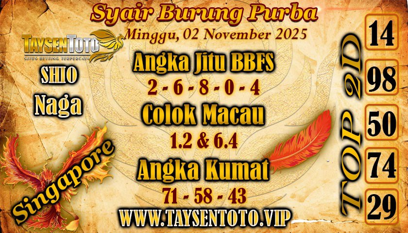 SYAIR TAYSEN SGP – Selamat datang di Situs Prediksi Togel Jitu dan Terpercaya. Hari ini kita akan mengulas Syair Togel SGP 02 November 2025 para pemain togel online dalam menebak secara tepat Angka Keluaran SGP.
