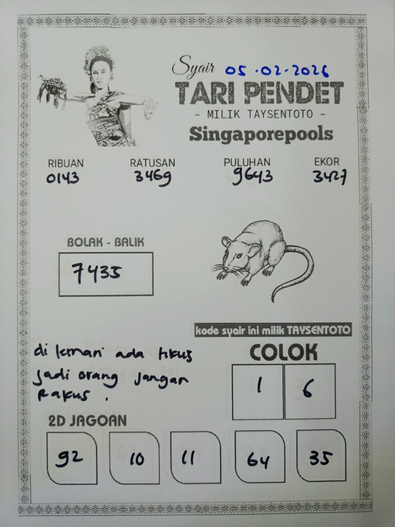 Syair Tari Pendet SGP Hari ini Kamis, 05 Februari 2026
