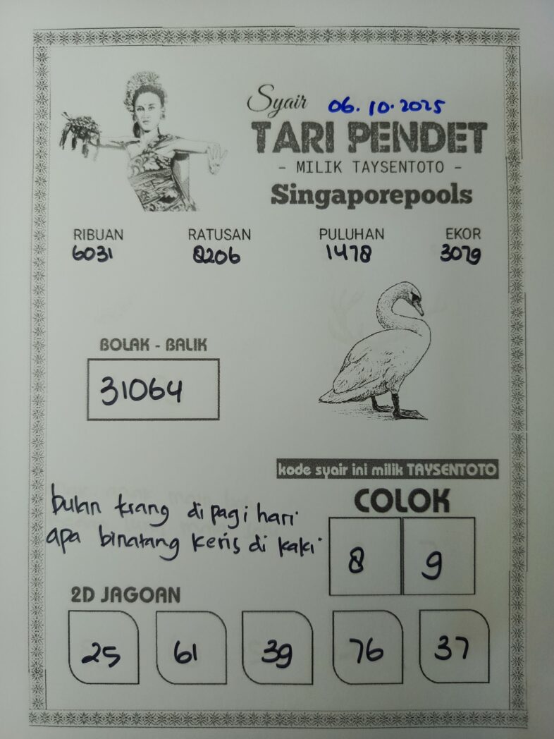 Syair Tari Pendet SGP Hari ini Senin, 06 Oktober 2025