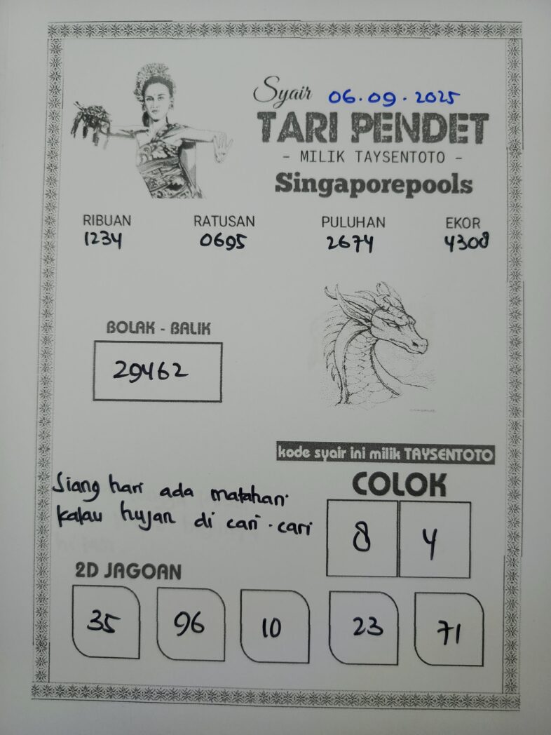 Syair Tari Pendet SGP Hari ini Sabtu, 06 September 2025