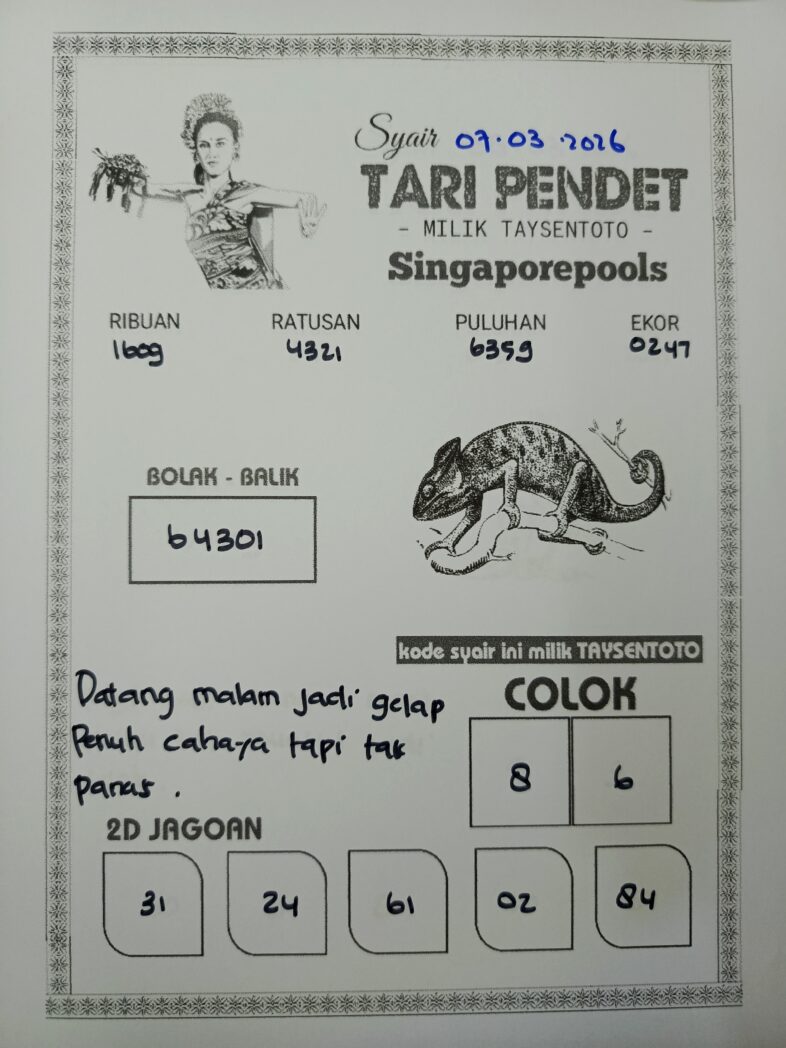 Syair Tari Pendet SGP Hari ini Sabtu, 07 Maret 2026