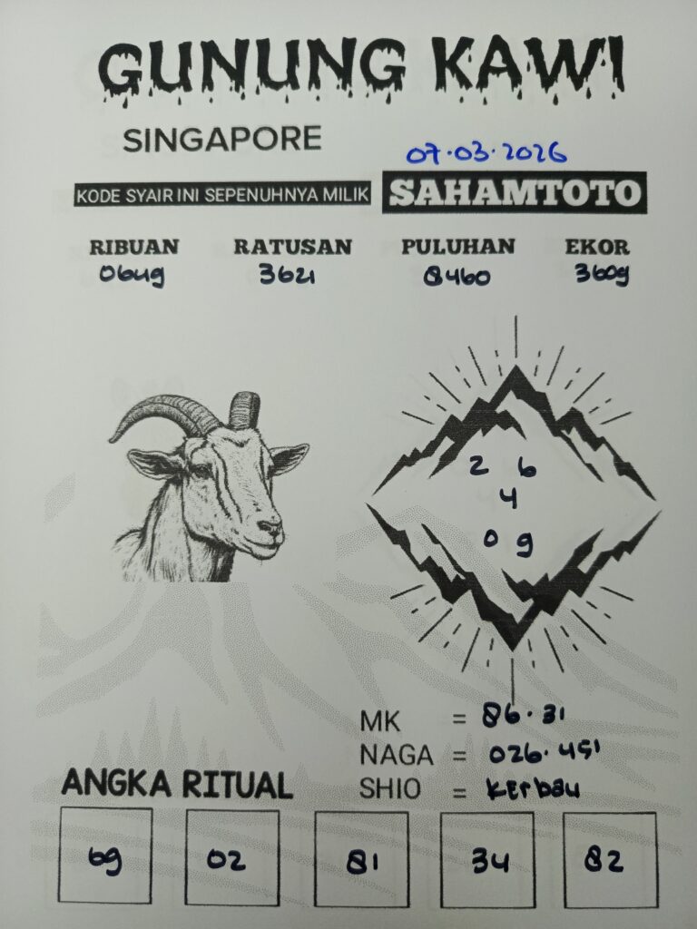 Syair Gunung Kawi SINGAPORE POOLS Hari ini sabtu 07 MARET 2026