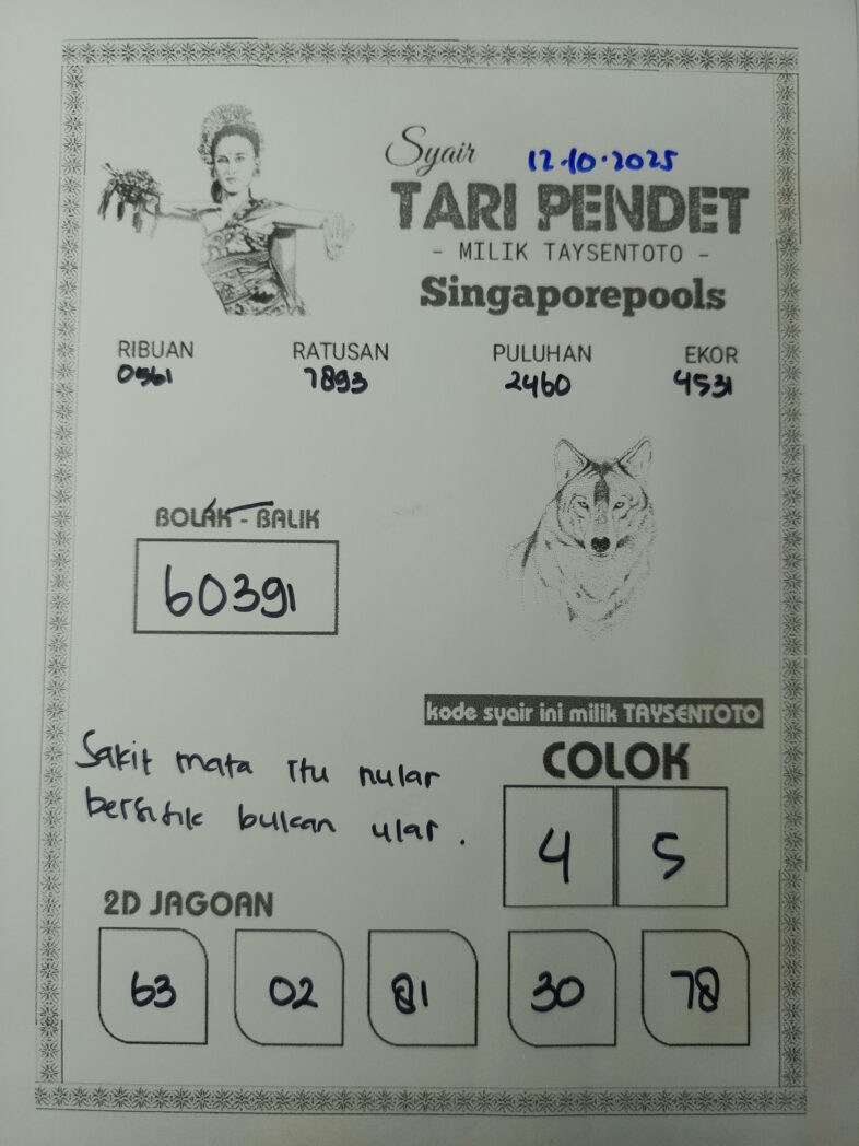 Syair Tari Pendet SGP Hari ini Minggu, 12 Oktober 2025