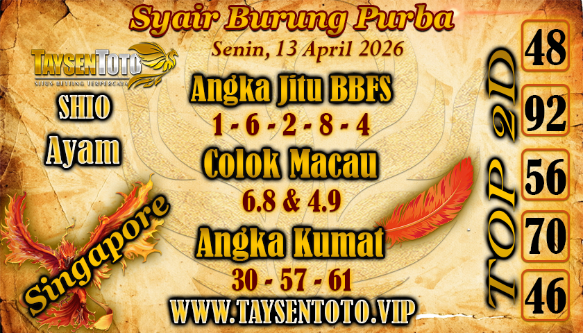 SYAIR TAYSEN SGP – Selamat datang di Situs Prediksi Togel Jitu dan Terpercaya. Hari ini kita akan mengulas Syair Togel SGP 13 April 2026 para pemain togel online dalam menebak secara tepat Angka Keluaran SGP.