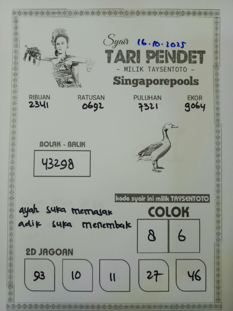 Syair Tari Pendet SGP Hari ini Kamis, 16 Oktober 2025