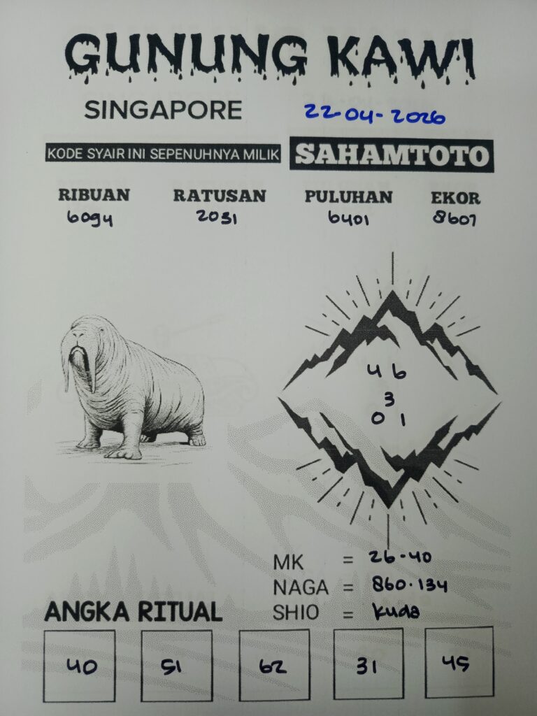 Syair Gunung Kawi SINGAPORE POOLS Hari ini rabu, 22 April 2026