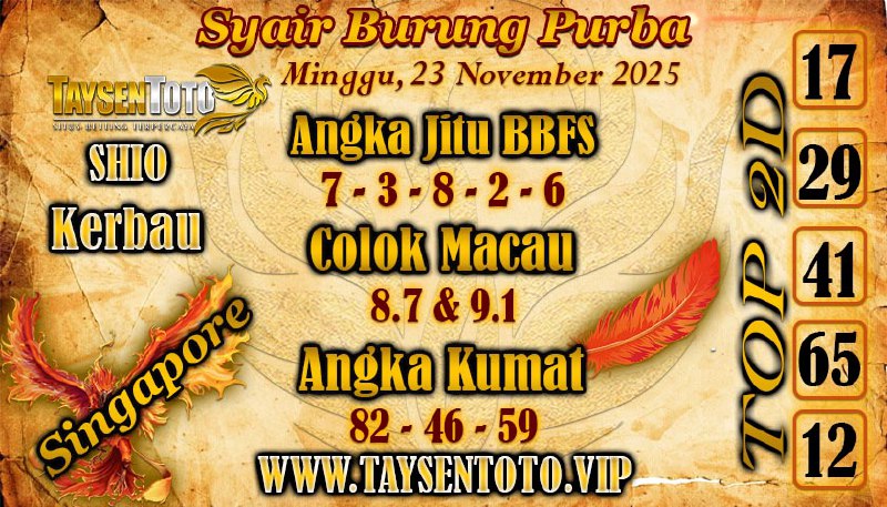 SYAIR TAYSEN SGP – Selamat datang di Situs Prediksi Togel Jitu dan Terpercaya. Hari ini kita akan mengulas Syair Togel SGP 23 November 2025 para pemain togel online dalam menebak secara tepat Angka Keluaran SGP.