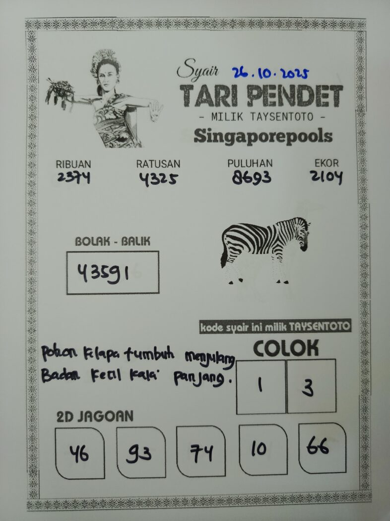 Syair Tari Pendet SGP Hari ini Minggu, 26 Oktober 2025