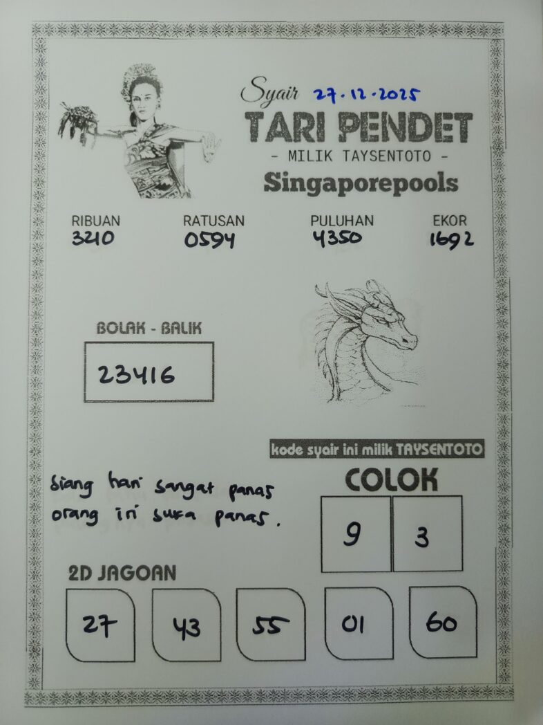 Syair Tari Pendet SGP Hari ini Sabtu, 27 Desember 2025