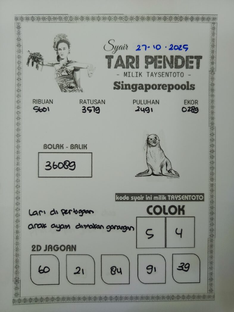 Syair Tari Pendet SGP Hari ini Senin, 27 Oktober 2025