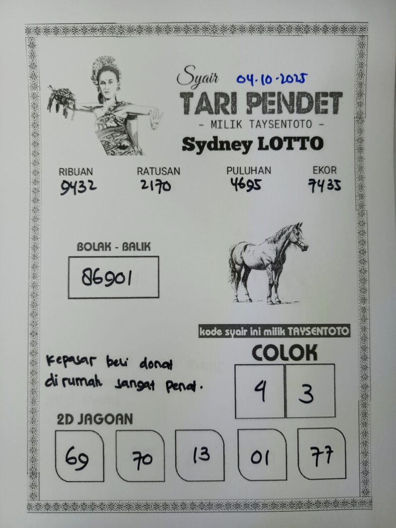 SYAIR TAYSEN SYDNEY – Selamat datang di Situs Prediksi Togel Jitu dan Terpercaya. Hari ini kita akan mengulas Syair Togel Sydney 04 Oktober 2025. Syair Sydney ini semata-mata hanya dibuat untuk membantu mempermudah para pemain togel online dalam menebak secara tepat Angka Keluaran Sydney.