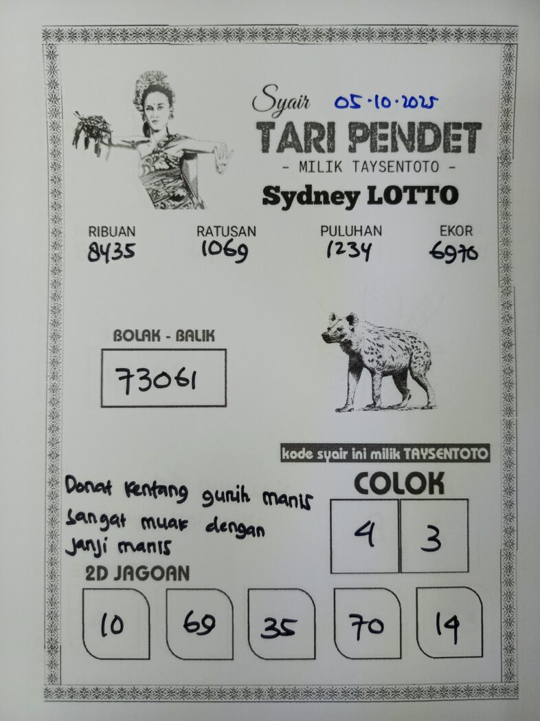 SYAIR TAYSEN SYDNEY – Selamat datang di Situs Prediksi Togel Jitu dan Terpercaya. Hari ini kita akan mengulas Syair Togel Sydney 05 Oktober 2025. Syair Sydney ini semata-mata hanya dibuat untuk membantu mempermudah para pemain togel online dalam menebak secara tepat Angka Keluaran Sydney.