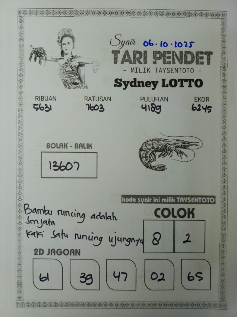 Syair Tari Pendet Sydney Hari ini Senin, 06 Oktober 2025