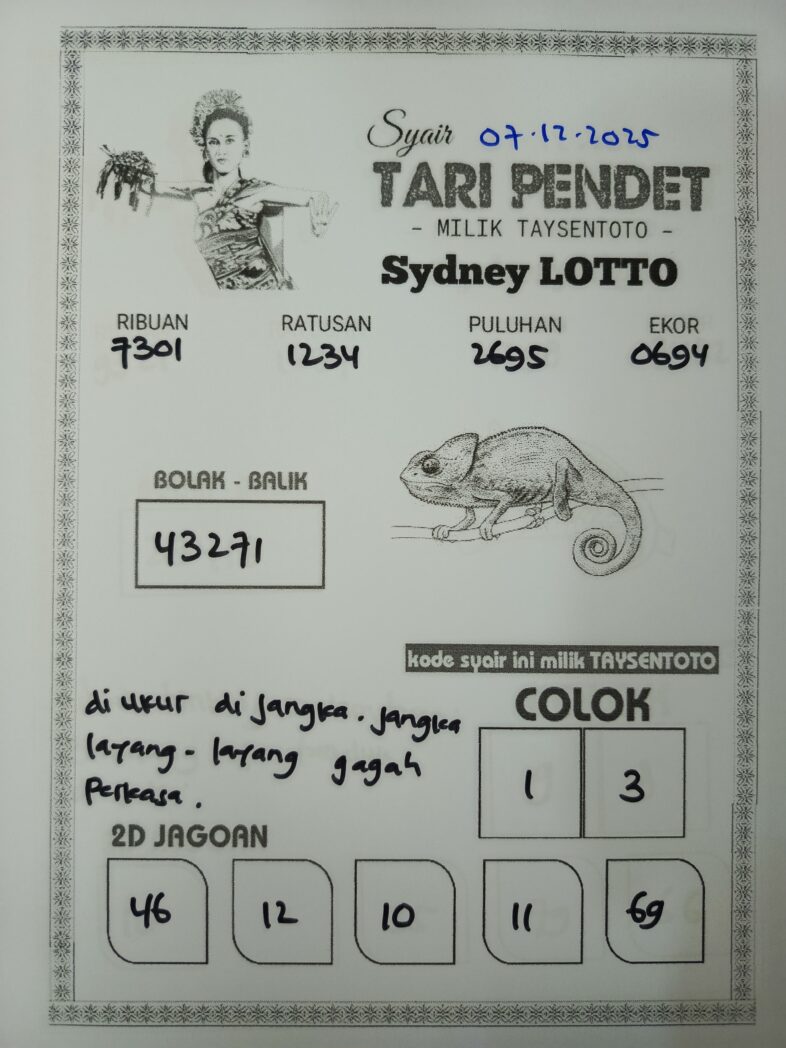SYAIR TAYSEN SYDNEY – Selamat datang di Situs Prediksi Togel Jitu dan Terpercaya. Hari ini kita akan mengulas Syair Togel Sydney 07 Desember 2025. Syair Sydney ini semata-mata hanya dibuat untuk membantu mempermudah para pemain togel online dalam menebak secara tepat Angka Keluaran Sydney.