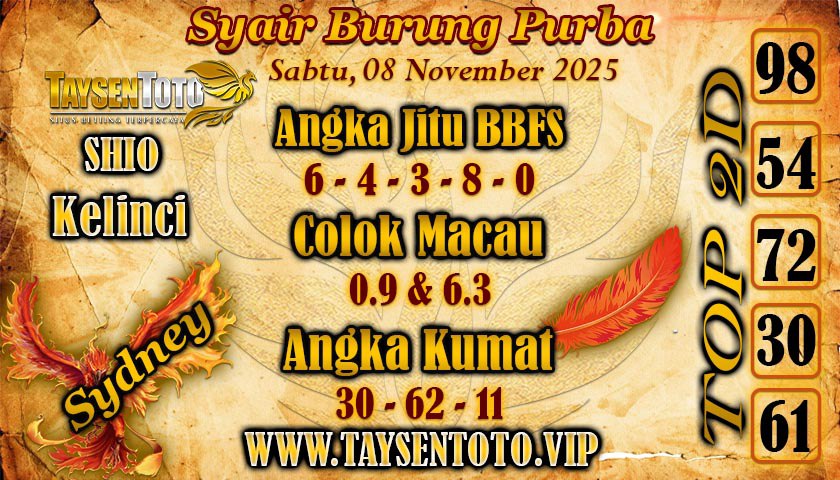 SYAIR TAYSEN SYDNEY – Selamat datang di Situs Prediksi Togel Jitu dan Terpercaya. Hari ini kita akan mengulas Syair Togel Sydney 08 November 2025. Syair Sydney ini semata-mata hanya dibuat untuk membantu mempermudah para pemain togel online dalam menebak secara tepat Angka Keluaran Sydney.