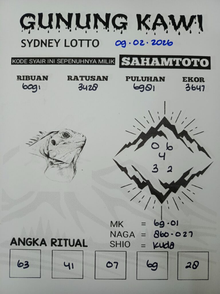 Syair Gunung Kawi SYDNEY LOTTO Hari ini 09Februari 2026