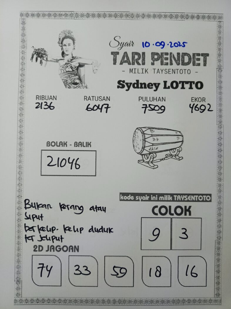 Syair Tari Pendet Sydney Hari ini Rabu, 10 September 2025