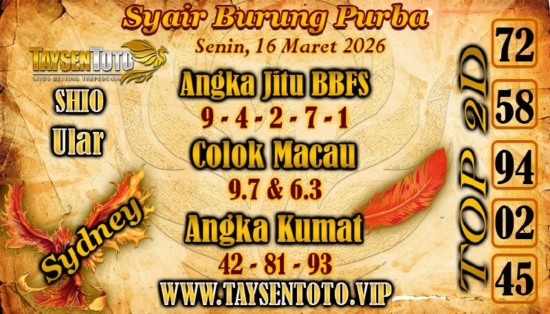 SYAIR TAYSEN SYDNEY – Selamat datang di Situs Prediksi Togel Jitu dan Terpercaya. Hari ini kita akan mengulas Syair Togel Sydney 16 Maret 2026. Syair Sydney ini semata-mata hanya dibuat untuk membantu mempermudah para pemain togel online dalam menebak secara tepat Angka Keluaran Sydney.