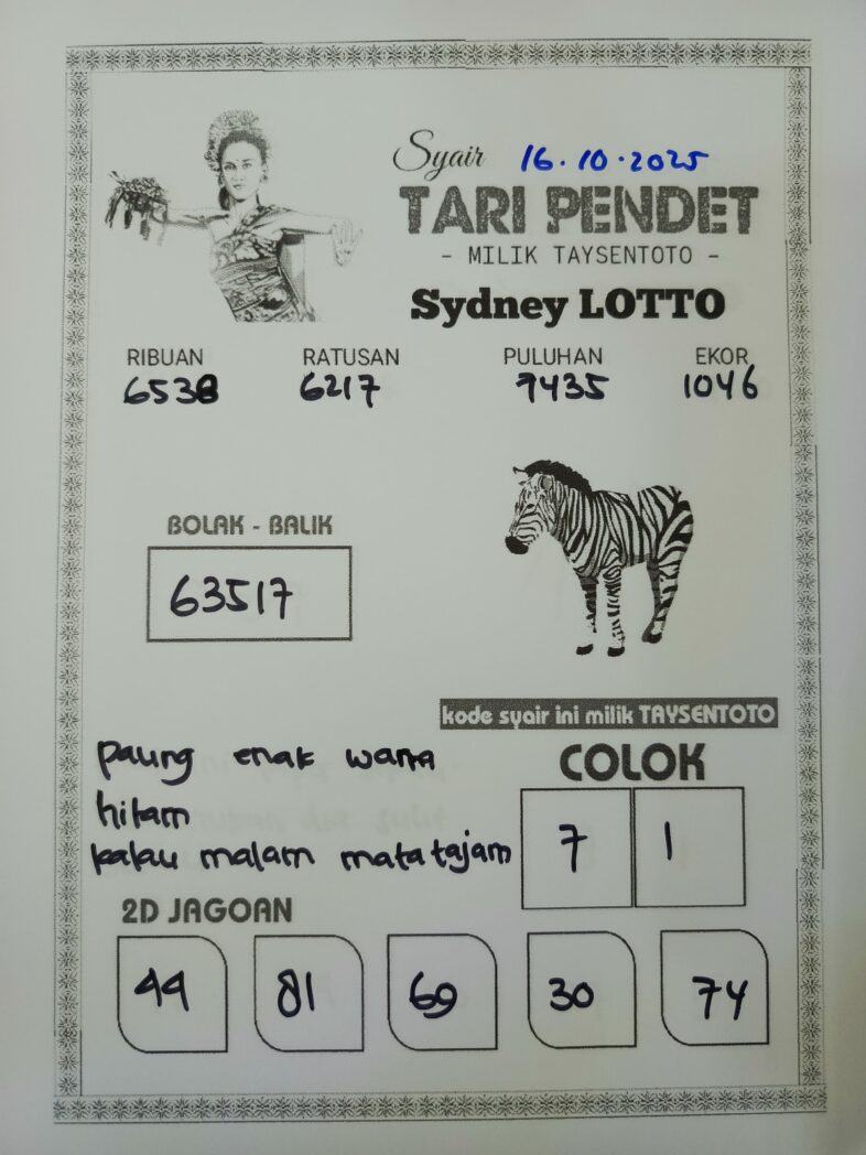 Syair Tari Pendet Sydney Hari ini Kamis, 16 Oktober 2025
