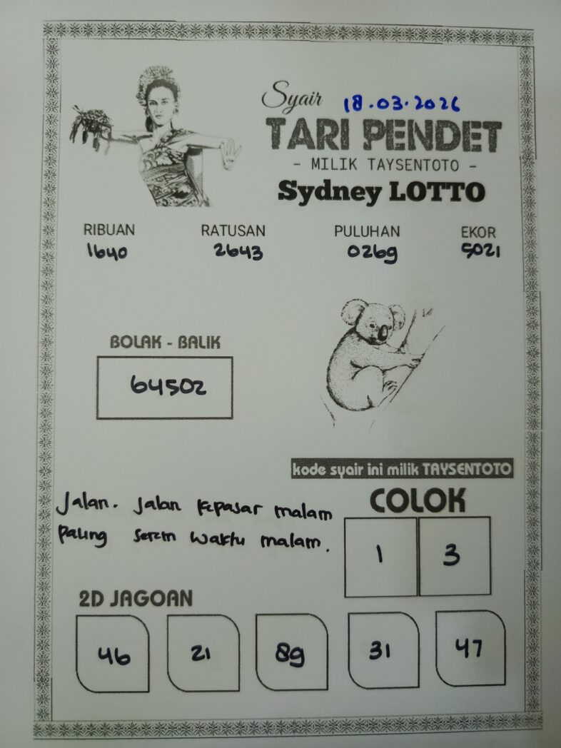 Syair Tari Pendet Sydney Hari ini Rabu, 18 Maret 2026