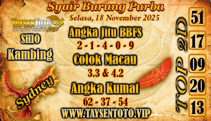 SYAIR TAYSEN SYDNEY – Selamat datang di Situs Prediksi Togel Jitu dan Terpercaya. Hari ini kita akan mengulas Syair Togel Sydney 18 November 2025. Syair Sydney ini semata-mata hanya dibuat untuk membantu mempermudah para pemain togel online dalam menebak secara tepat Angka Keluaran Sydney.