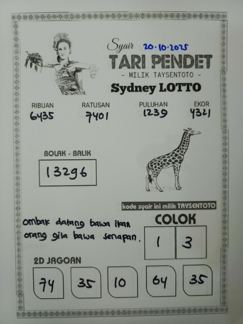 Syair Tari Pendet Sydney Hari ini Senin, 20 Oktober 2025