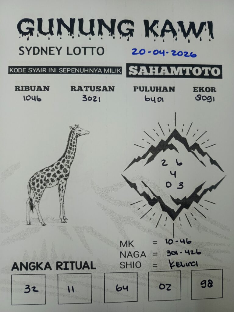 Syair Gunung Kawi SYDNEY LOTTO Hari ini SENIN 20 April 2026