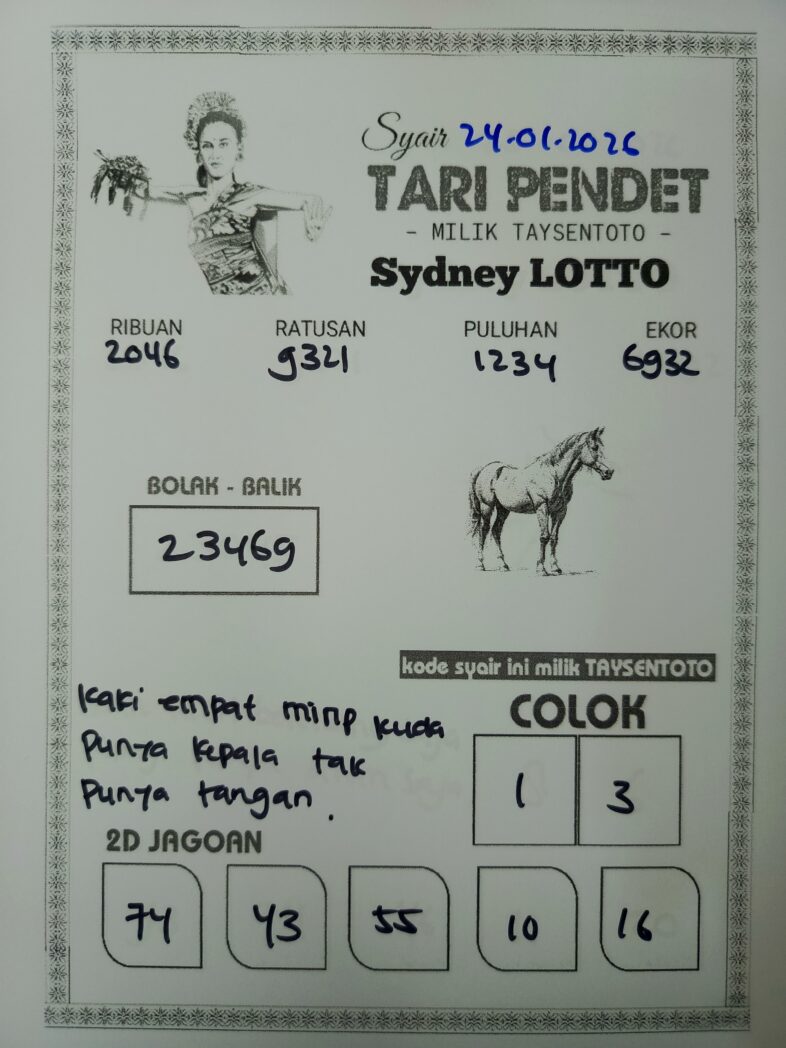 SYAIR TAYSEN SYDNEY – Selamat datang di Situs Prediksi Togel Jitu dan Terpercaya. Hari ini kita akan mengulas Syair Togel Sydney 24 Januari 2026. Syair Sydney ini semata-mata hanya dibuat untuk membantu mempermudah para pemain togel online dalam menebak secara tepat Angka Keluaran Sydney.