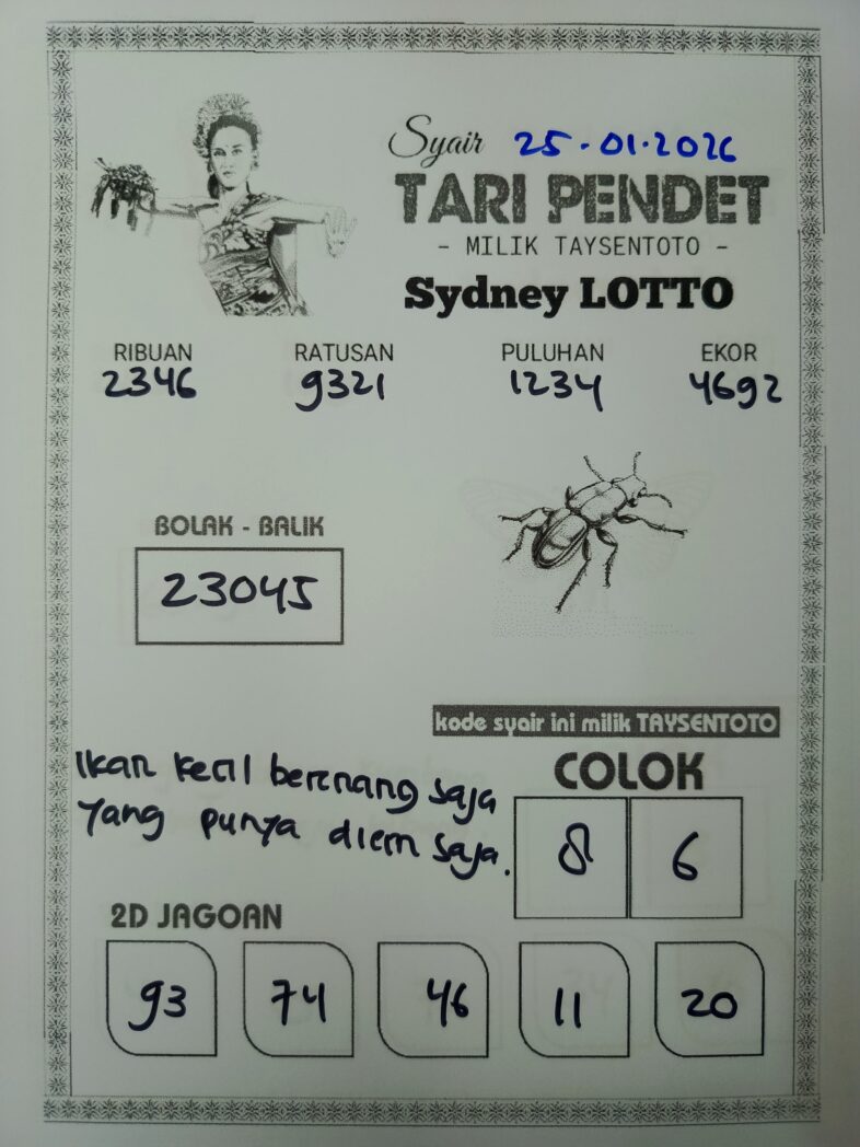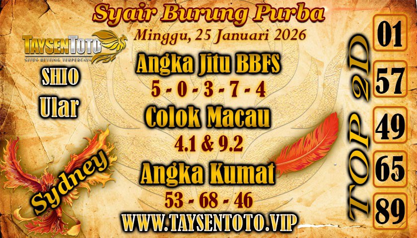 SYAIR TAYSEN SYDNEY – Selamat datang di Situs Prediksi Togel Jitu dan Terpercaya. Hari ini kita akan mengulas Syair Togel Sydney 25 Januari 2026. Syair Sydney ini semata-mata hanya dibuat untuk membantu mempermudah para pemain togel online dalam menebak secara tepat Angka Keluaran Sydney.