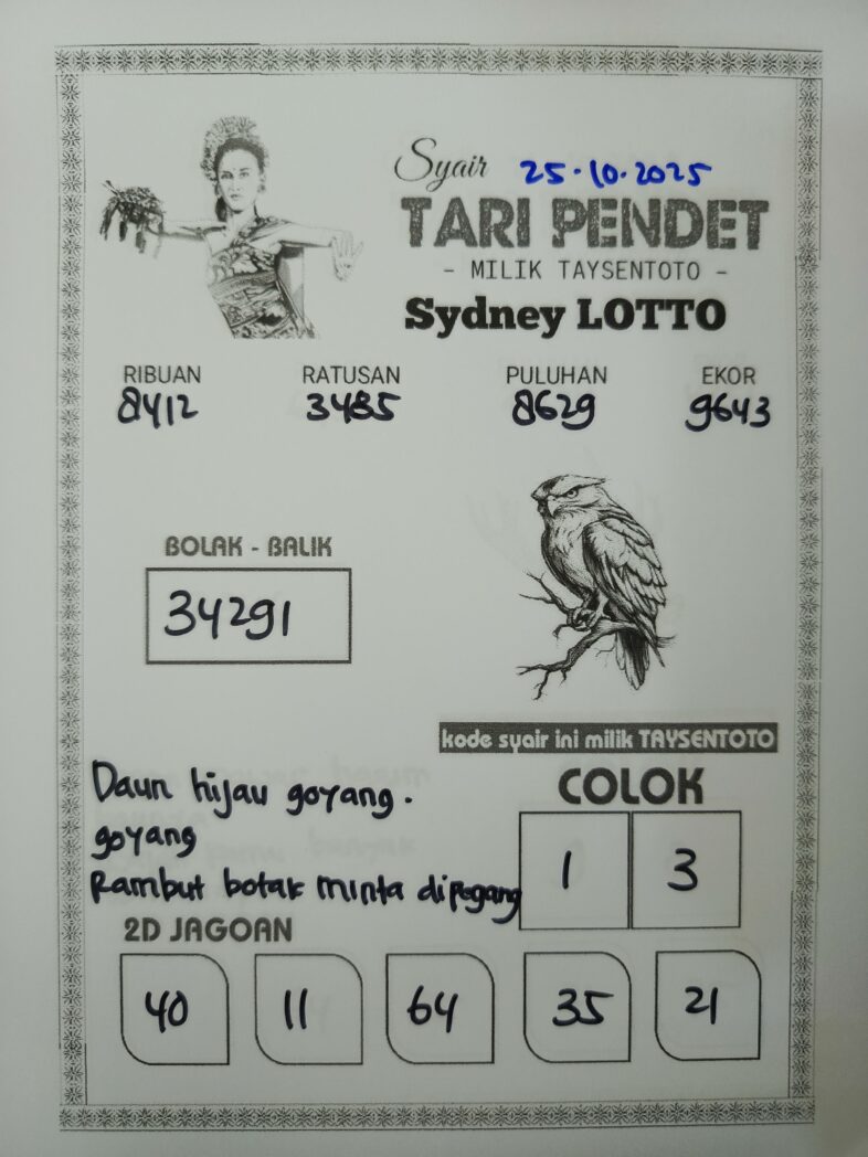 SYAIR TAYSEN SYDNEY – Selamat datang di Situs Prediksi Togel Jitu dan Terpercaya. Hari ini kita akan mengulas Syair Togel Sydney 25 Oktober 2025. Syair Sydney ini semata-mata hanya dibuat untuk membantu mempermudah para pemain togel online dalam menebak secara tepat Angka Keluaran Sydney.