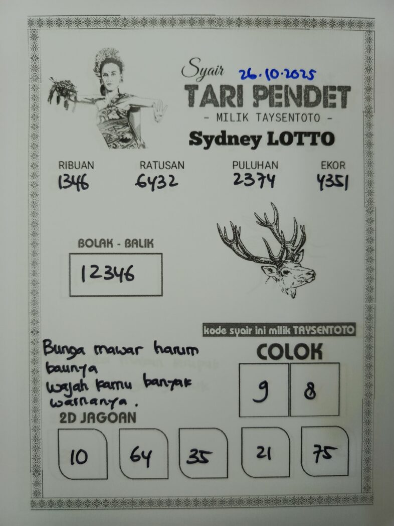 SYAIR TAYSEN SYDNEY – Selamat datang di Situs Prediksi Togel Jitu dan Terpercaya. Hari ini kita akan mengulas Syair Togel Sydney 26 Oktober 2025. Syair Sydney ini semata-mata hanya dibuat untuk membantu mempermudah para pemain togel online dalam menebak secara tepat Angka Keluaran Sydney.