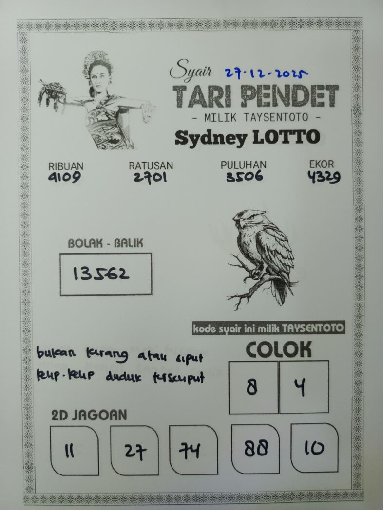 SYAIR TAYSEN SYDNEY – Selamat datang di Situs Prediksi Togel Jitu dan Terpercaya. Hari ini kita akan mengulas Syair Togel Sydney 27 Desember 2025. Syair Sydney ini semata-mata hanya dibuat untuk membantu mempermudah para pemain togel online dalam menebak secara tepat Angka Keluaran Sydney.